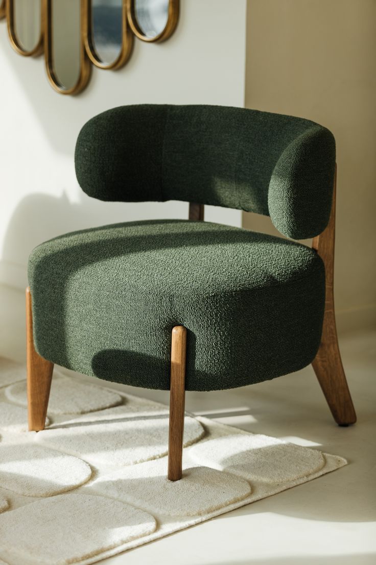 Where form meets comfort — the Oliva Forma Arm Chair brings sculptural elegance to your living space. Upholstered in rich olive green fabric, its rounded silhouette and natural wood legs blend organic warmth with modern design. Ideal for reading corners, cozy lounges, or statement seating.